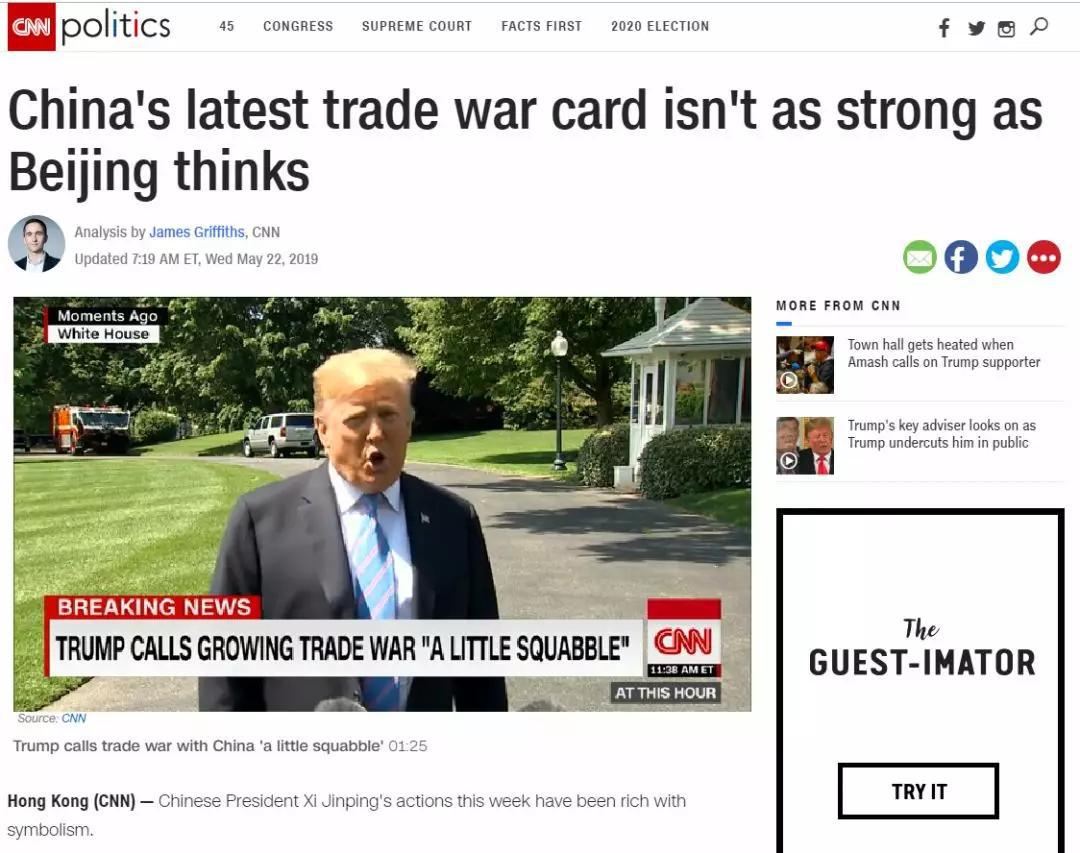 也有一些美國媒體沒那么悲觀。CNN就發(fā)表了一篇評論,稱稀土這張“貿(mào)易戰(zhàn)牌”沒有想象的那么強大。